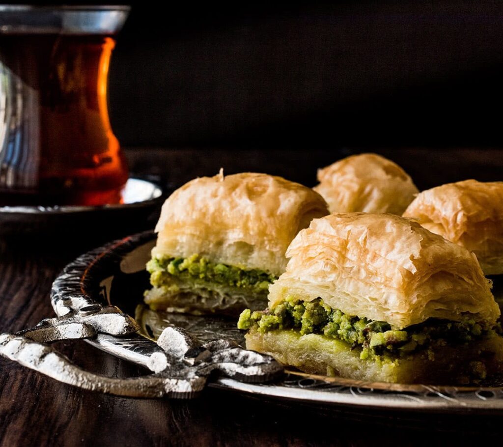 Baklava is een zoet, geurig gebak uit het Midden-Oosten en de Balkan, gemaakt van knapperige laagjes filodeeg, gesmolten boter en een vulling van fijngehakte noten (vaak pistache of walnoot). Het wordt na het bakken overgoten met een suiker- of honingsiroop, soms met citroen of rozenwater.